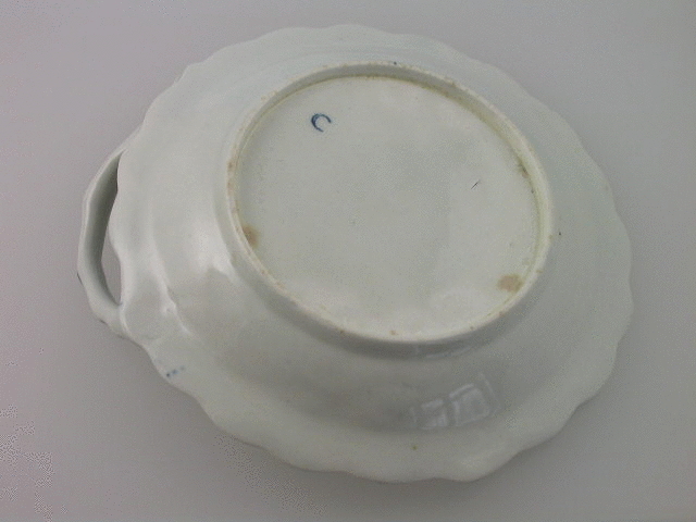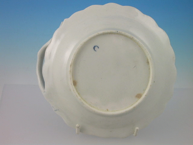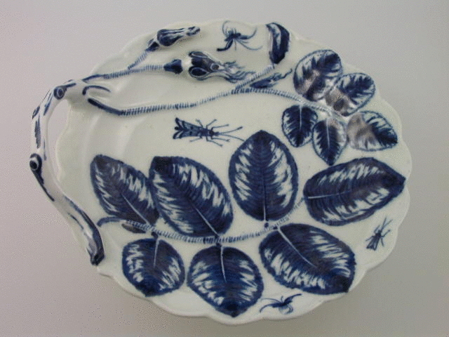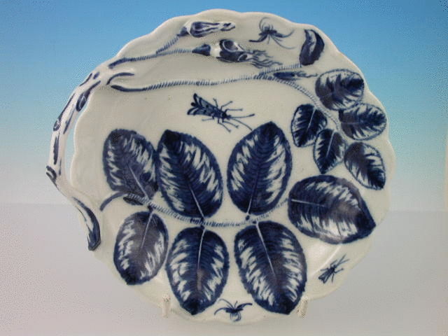 A very fine Dr Wall Worcester “Blind Earl” Sweet Meat Dish of moulded form, with stalk handle, painted in underglaze blue with floral sprays and insects. c1765.