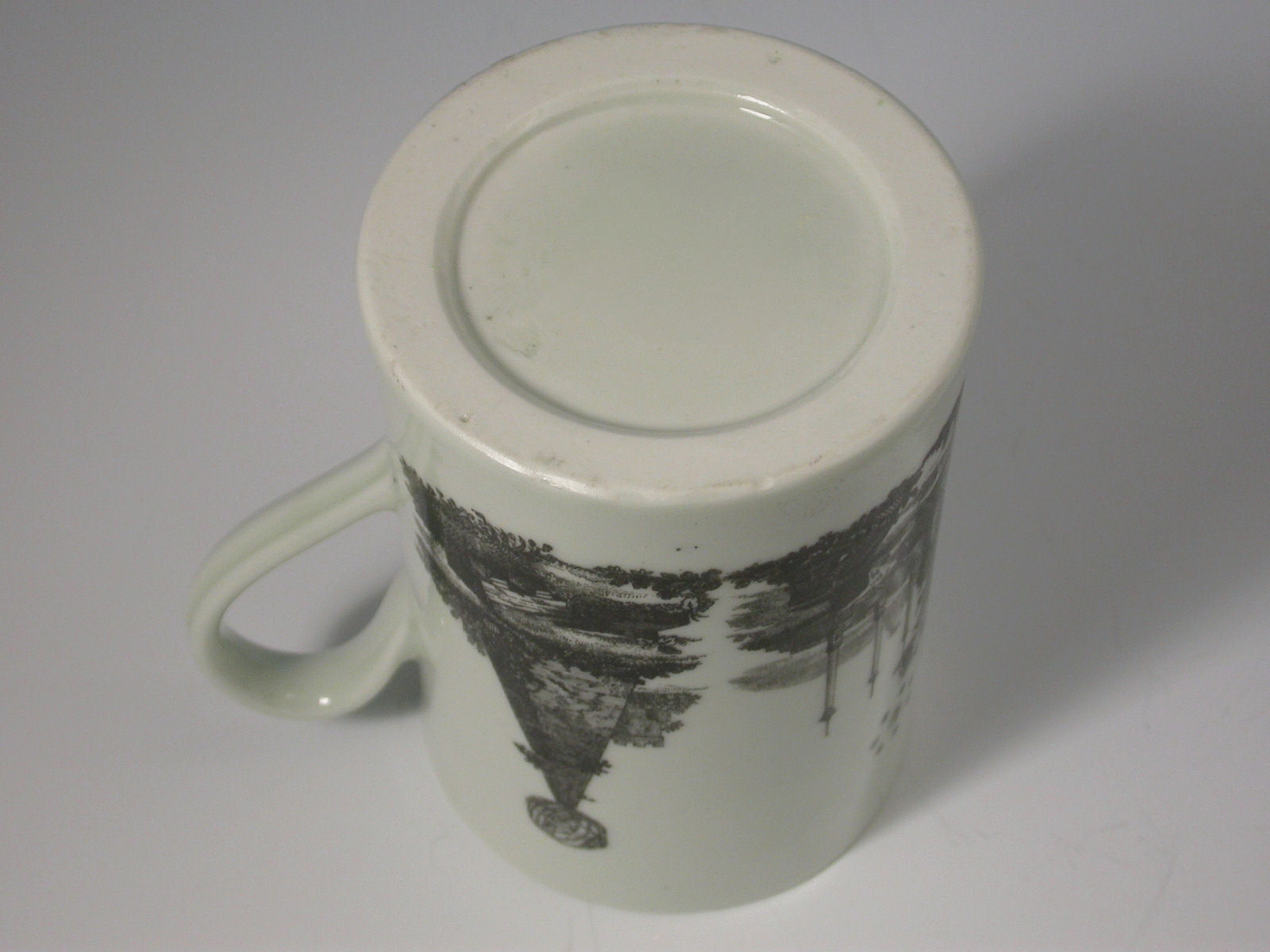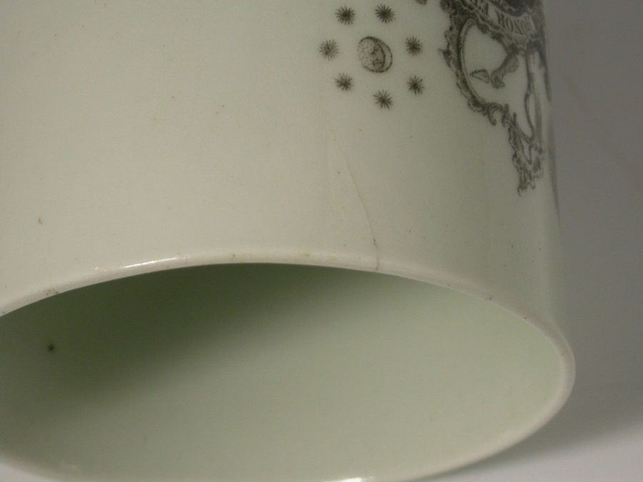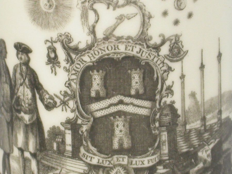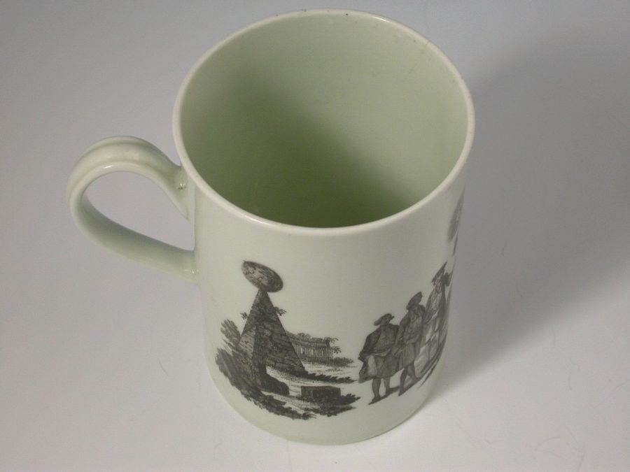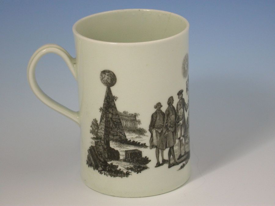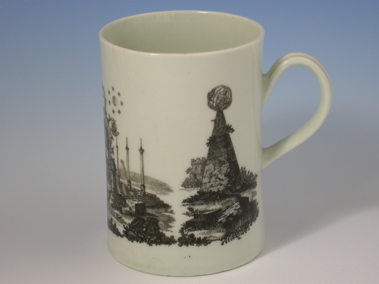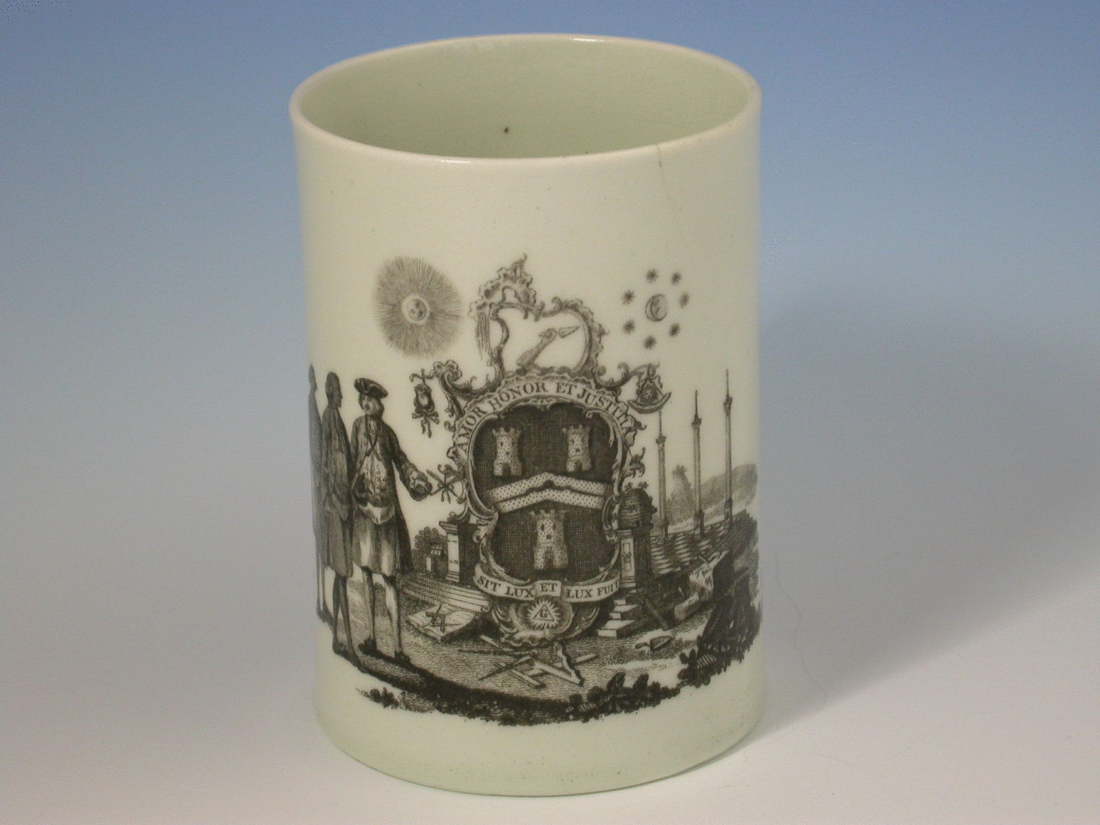 A rare first period Worcester mug with grooved strap handle, printed in black with the Freemason’s Company Coat of Arms and obelisks, by Hancock.
