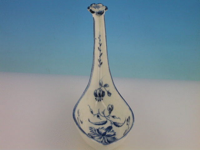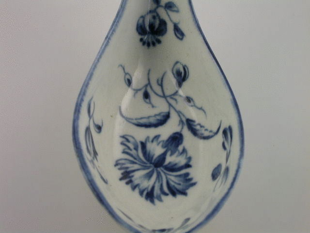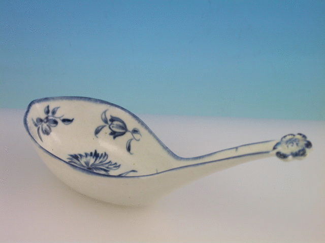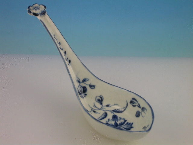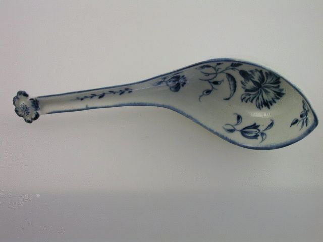 A good Worcester oval deep bowled Rice Spoon, turnover handle with applied moulded flower head, painted with the Gillyflower pattern, the handle with a small leaf stalk, blue line rim.