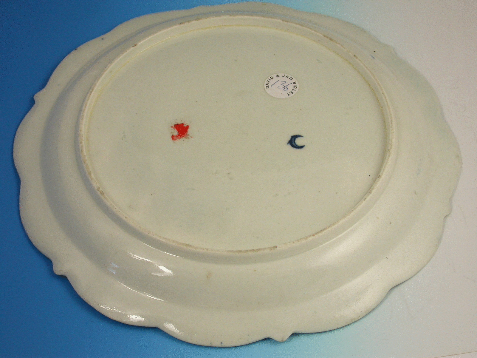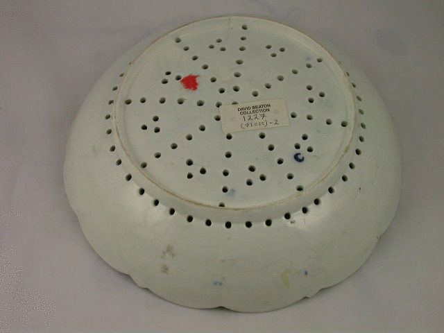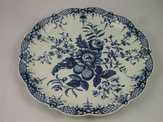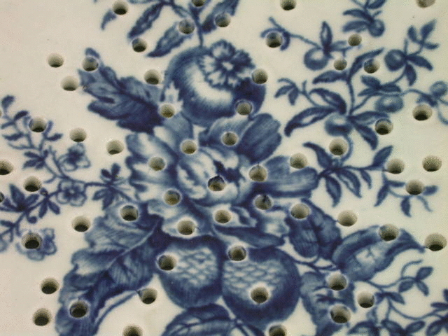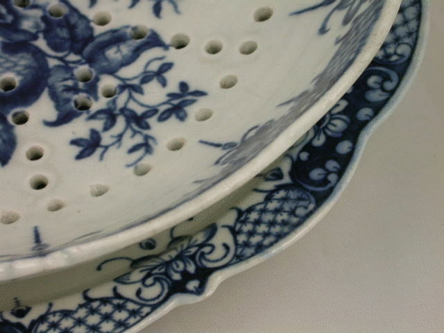 A First Period Worcester pierced Strawberry Dish and Stand, printed with the Pinecone pattern.