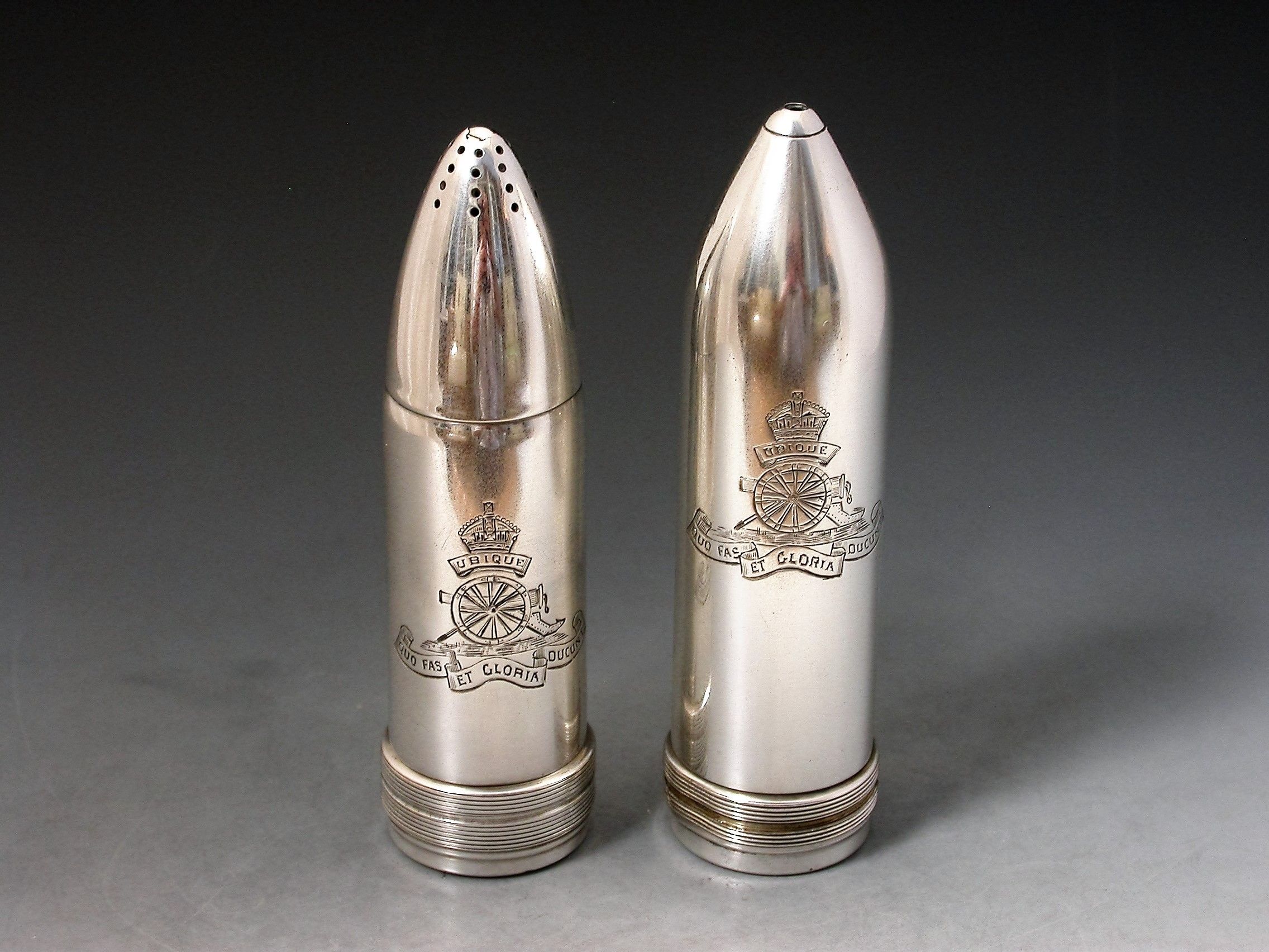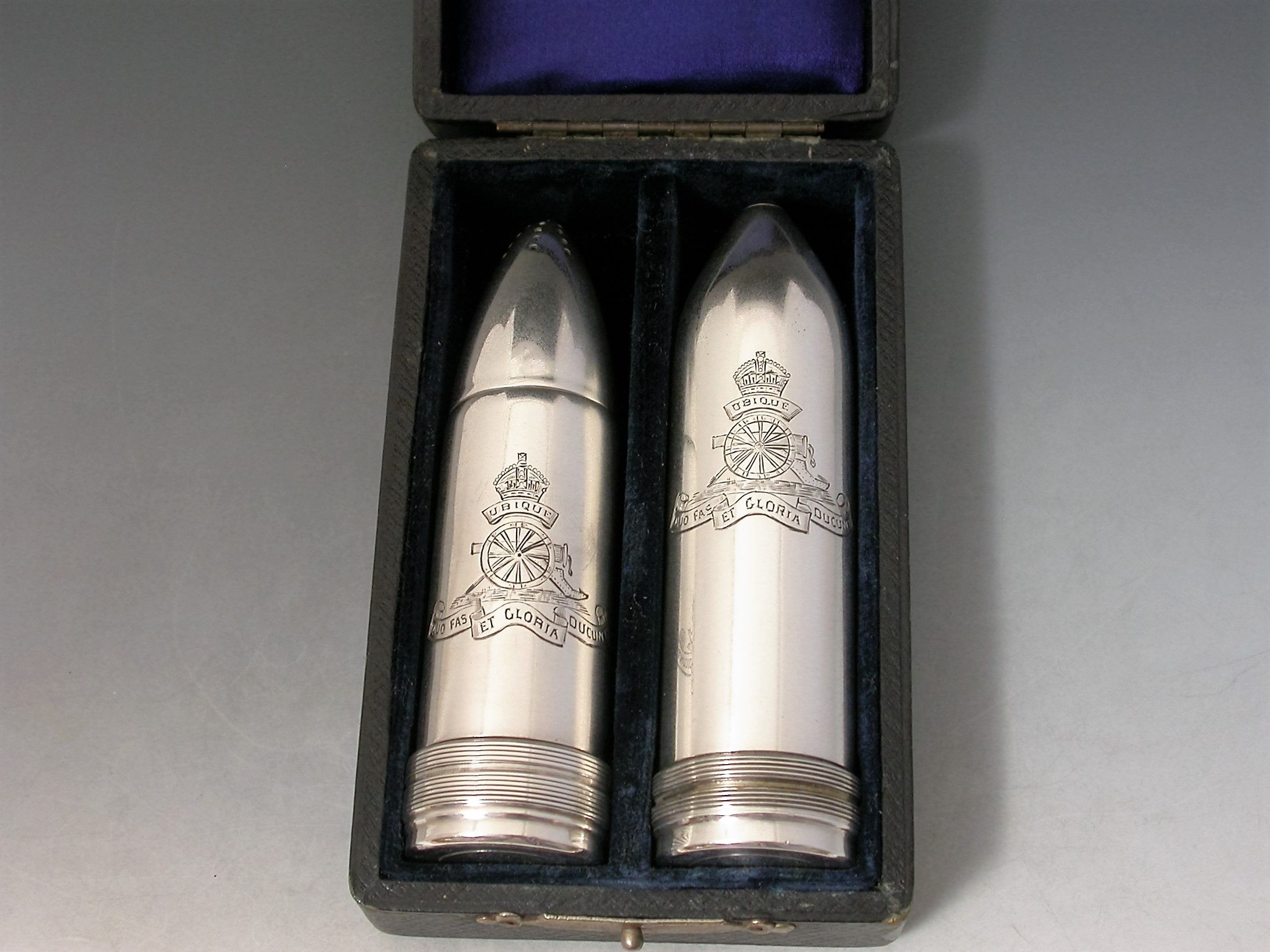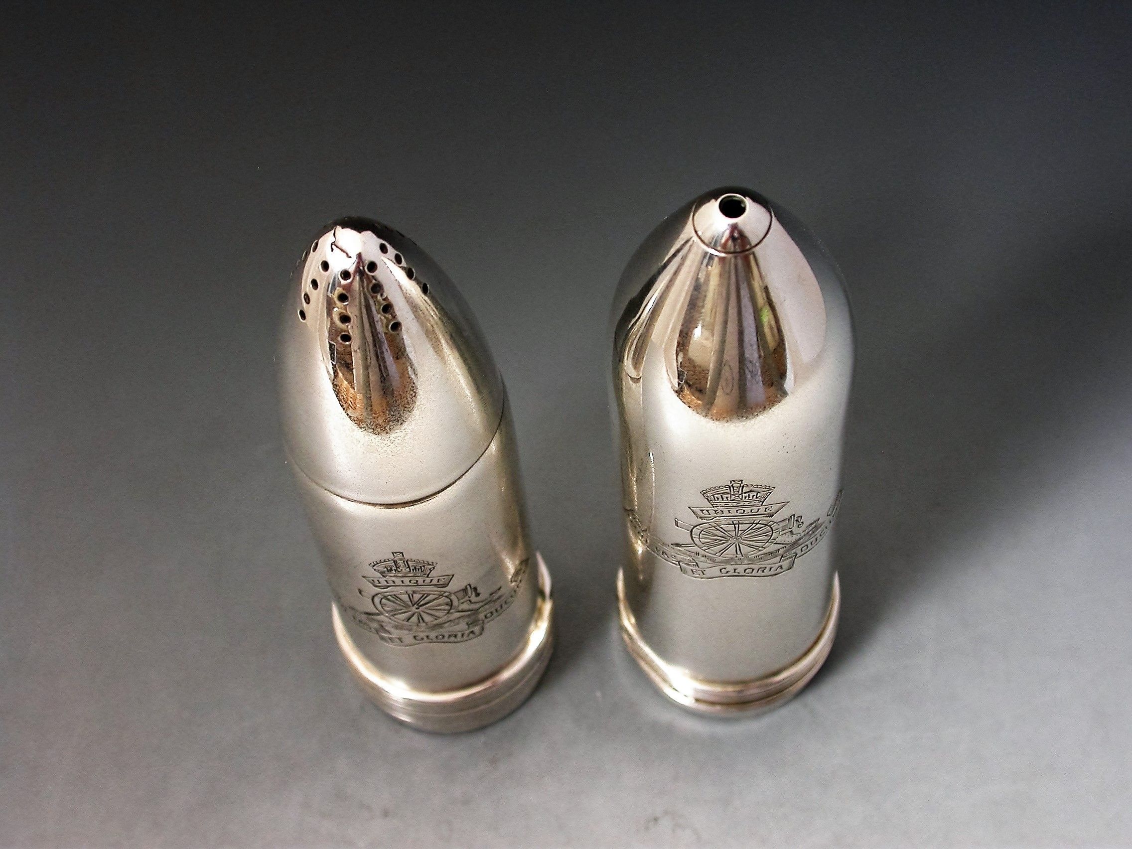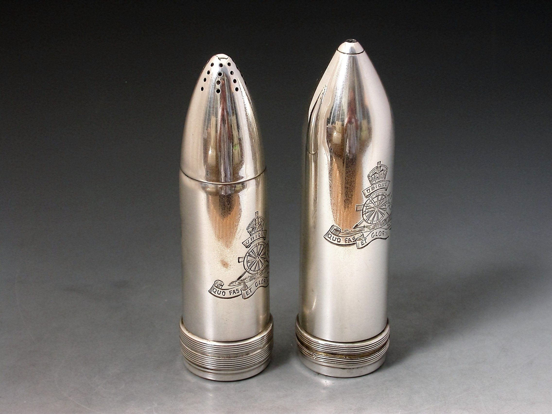 A rare World War One novelty silver Condiment Set formed as a pair of Artillery Shells, each engraved with the regimental badge of the Royal Artillery.