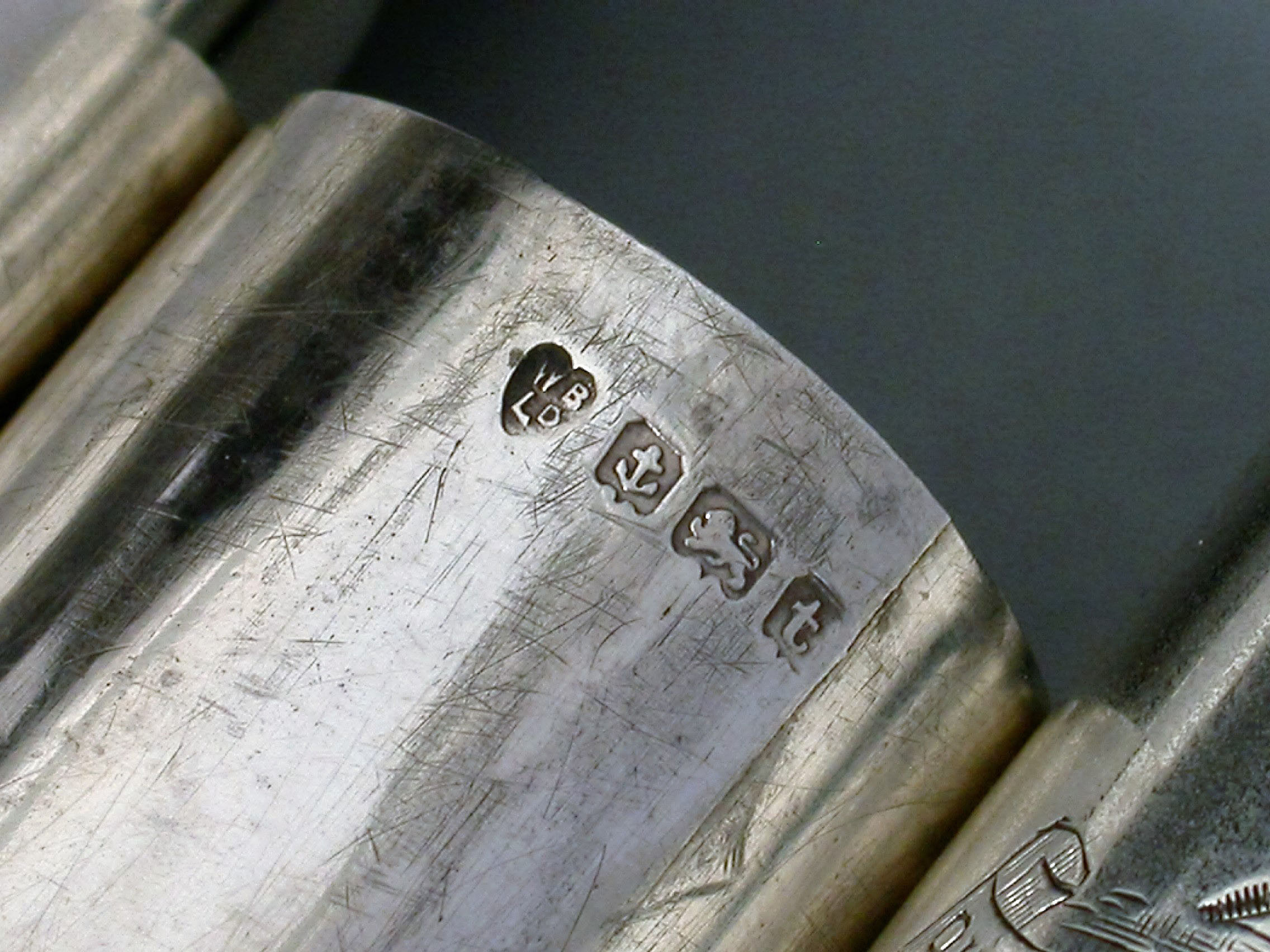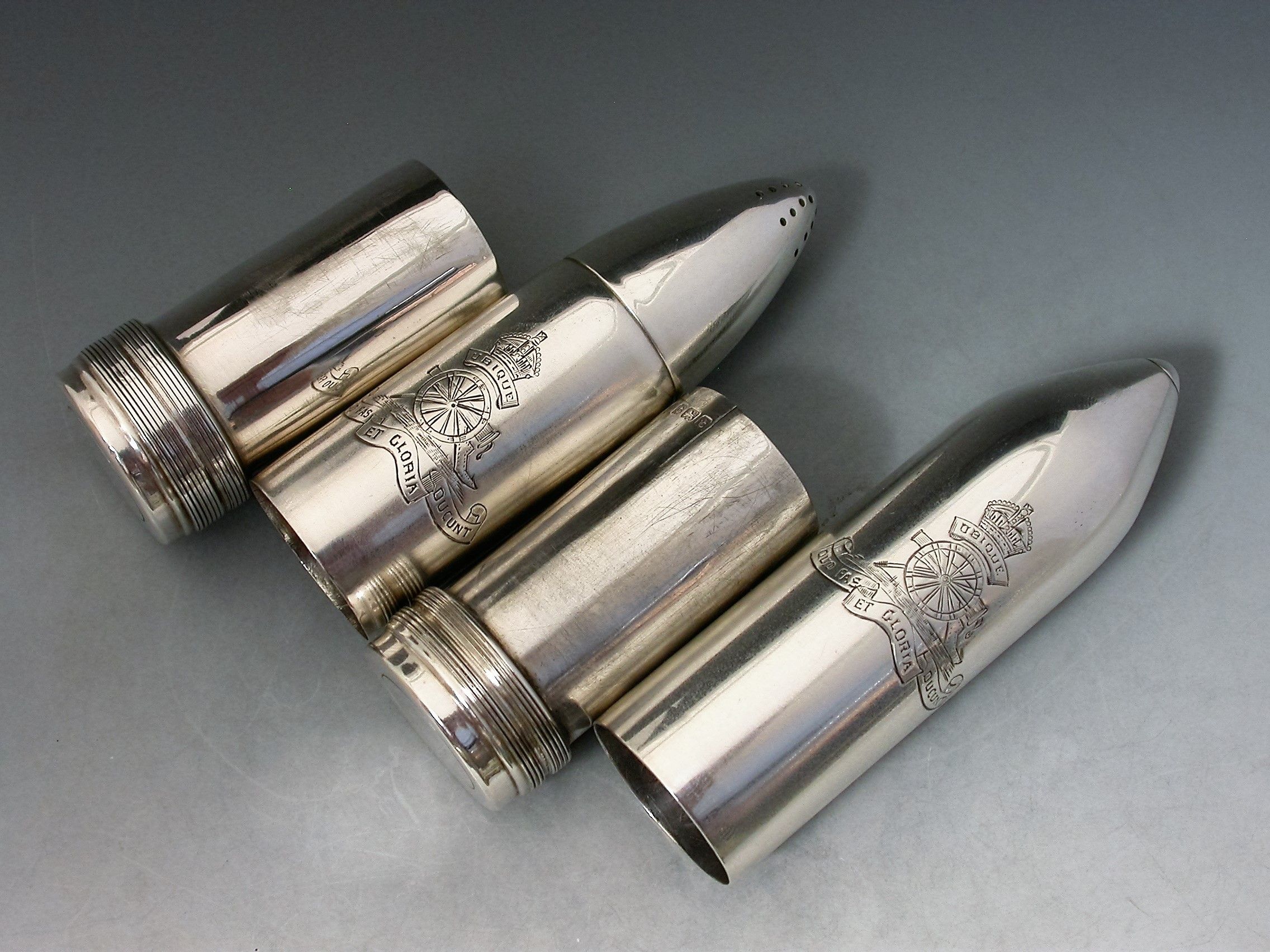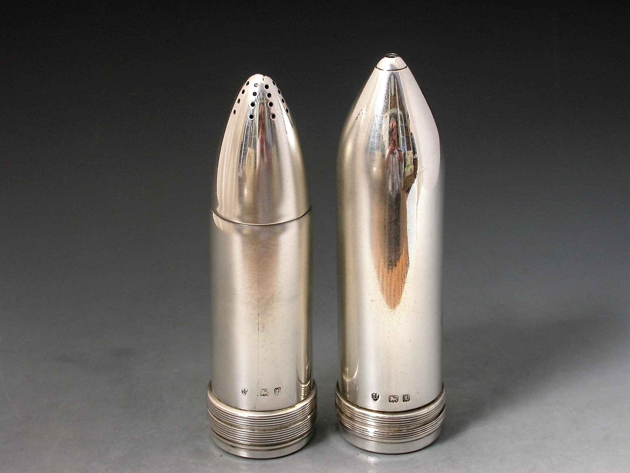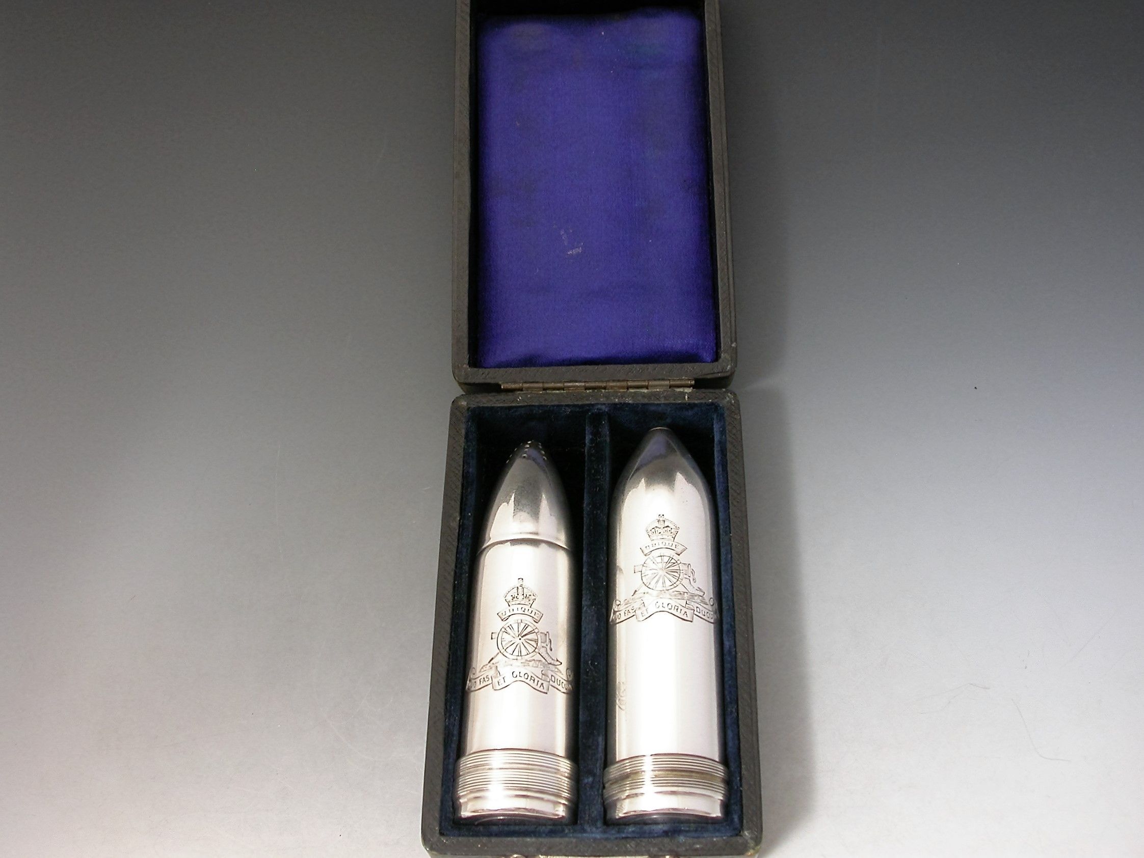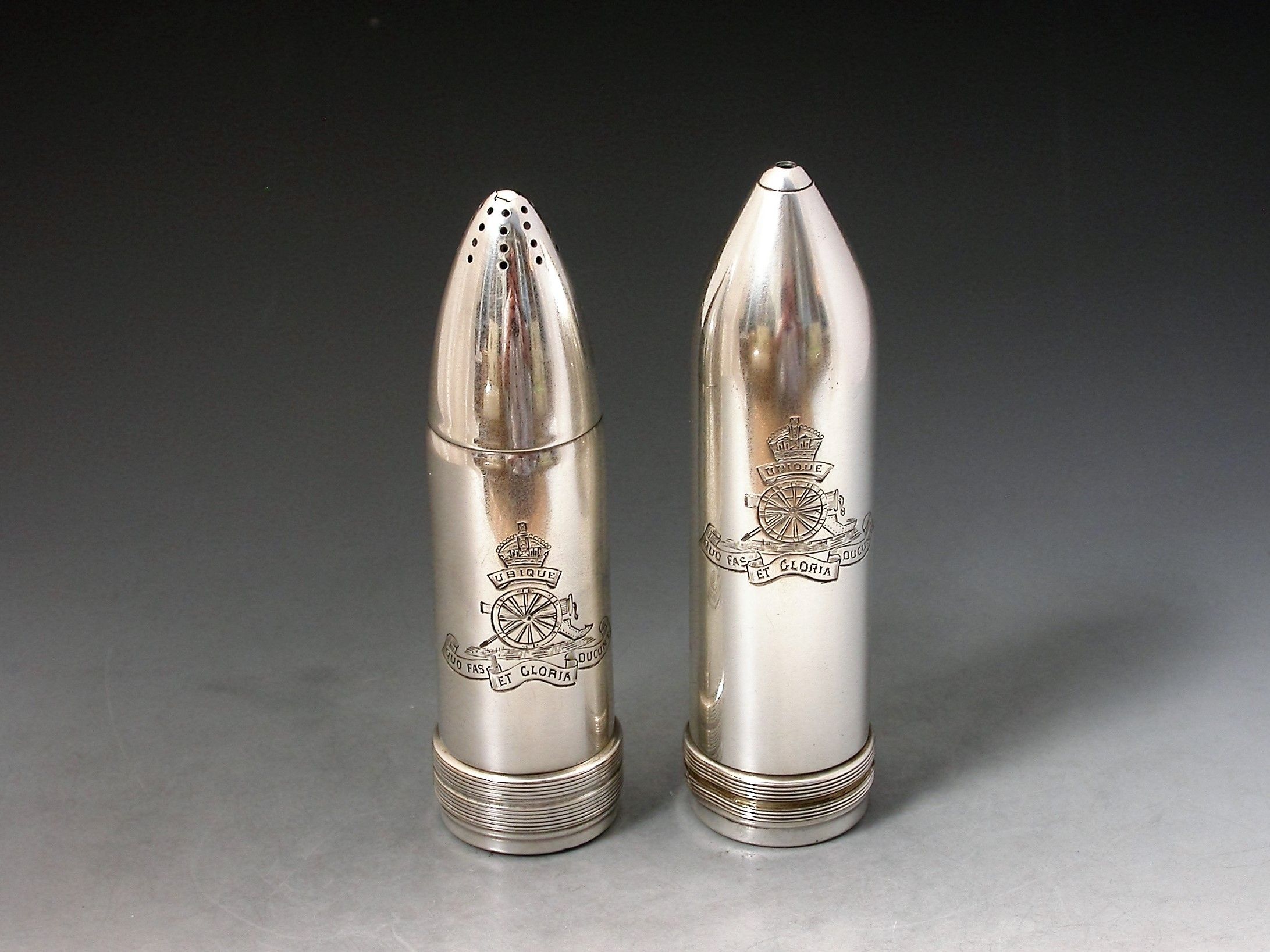 A rare World War One novelty silver Condiment Set formed as a pair of Artillery Shells, each engraved with the regimental badge of the Royal Artillery.